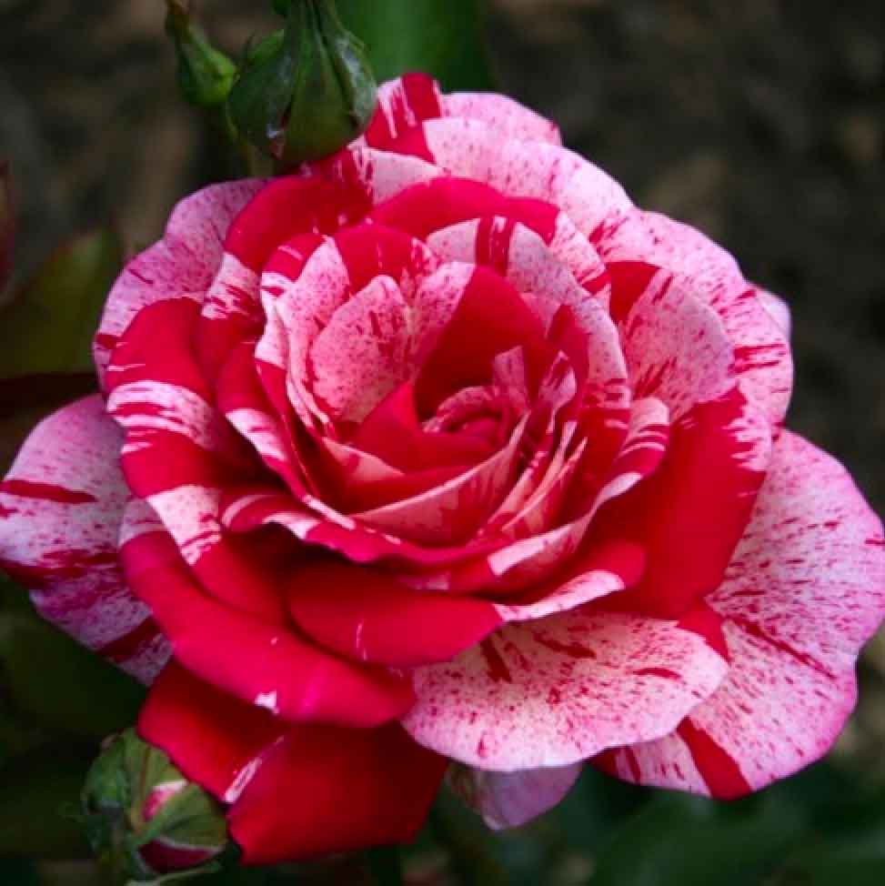 Чайно-гибридная роза с бутонами классической формы, которые раскрываются в крупные махровые малиново-красные цветки с белыми полосками, причем расположение этих полосок уникально для каждого цветка. Аромата практически нет. Цветение повторное. Куст крепкий, компактный, высотой около метра или чуть больше, компактный, со светло-зеленой листвой, устойчивой к заболеваниям.